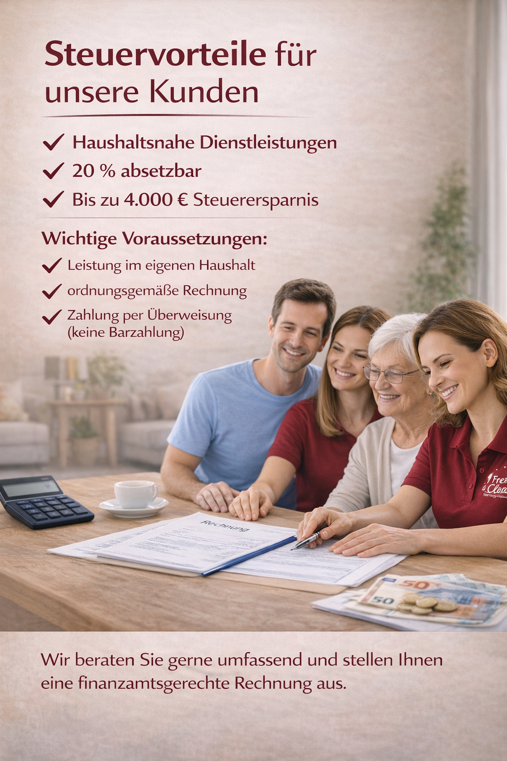 Als professioneller Dienstleister möchten wir Sie darüber informieren, dass viele unserer Leistungen steuerlich geltend gemacht werden können. Dazu zählen insbesondere unsere Angebote im Bereich Haushaltshilfe, Reinigung und Betreuung im eigenen Zuhause.