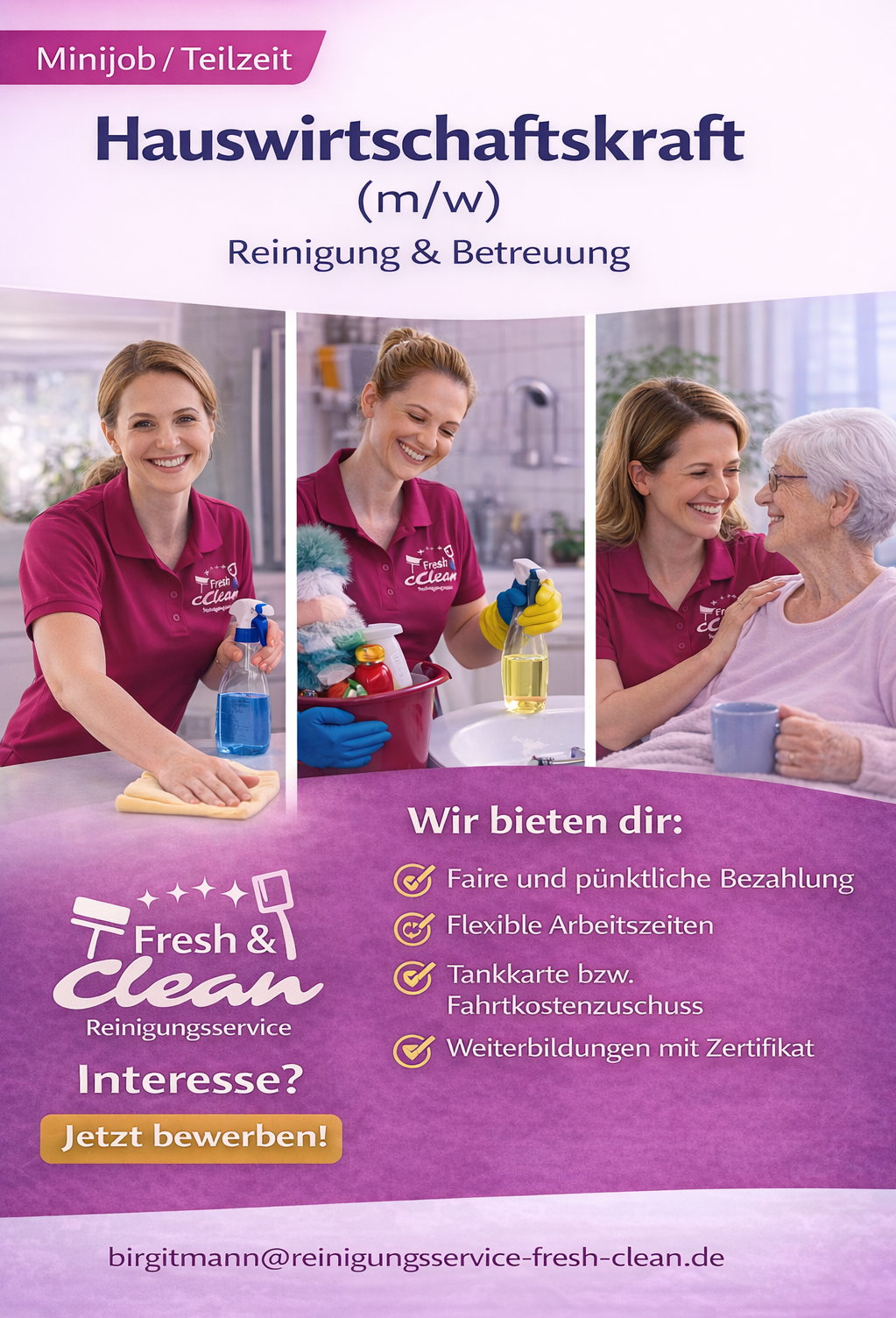 Zur Verstärkung unseres Teams suchen wir ab sofort eine zuverlässige Hauswirtschaftskraft (m/w) auf Minijob-Basis, mit der Option auf Teilzeit.